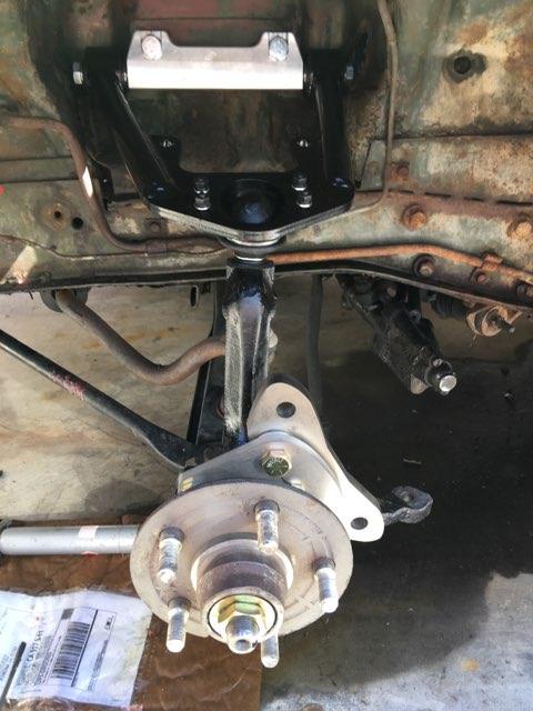 Mercury Comet front suspension with spindle, hub, and caliper brackets installed. The Brembo brackets took the majority of time to create, design, and fabricate them.