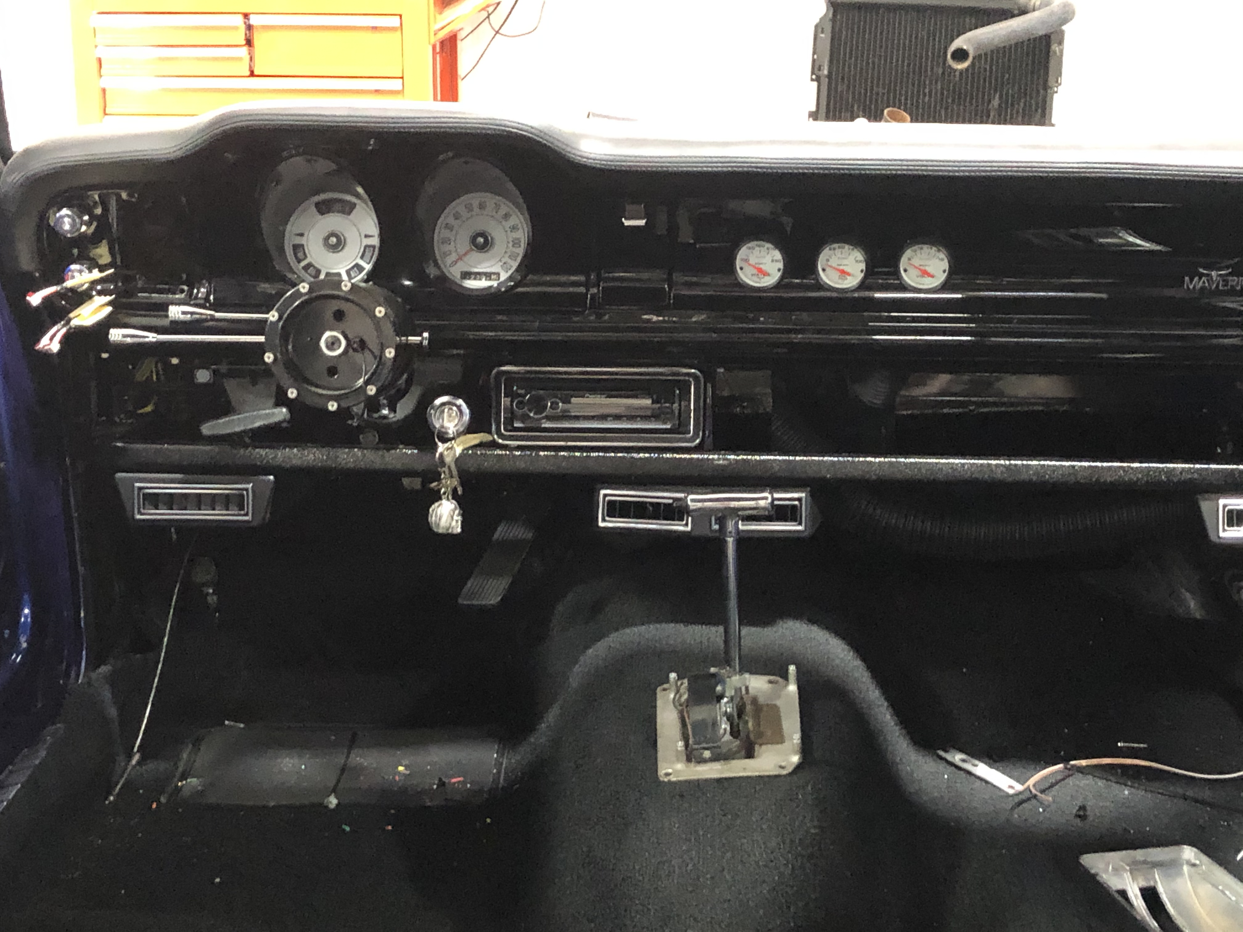 New autometer gauges, vintage air, tilt steering, shifter(not installed yet), carpet, rear seat, front bucket rails are being fabricated, and a new stereo.